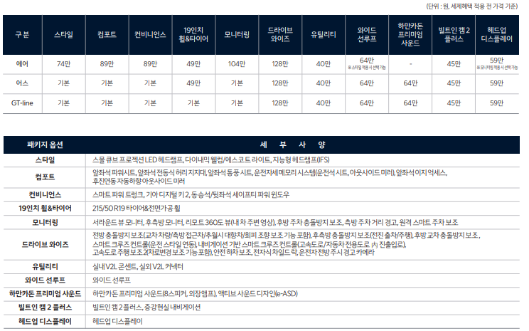 EV4의 트림은 에어(스탠다드, 롱레인지), 어스(스탠다드, 롱레인지), GT-line(스탠다드, 롱레인지)로 총 6개 트림으로 출시 됩니다.