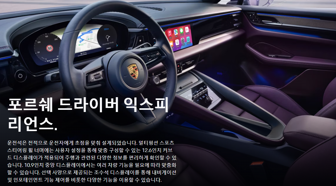 실내에는 12.6인치 커브드 클러스터와 10.9인치 중앙 디스플레이가 기본탑재 되며 조수석 디스플레이는 유료 옵션으로 선택할 수 있습니다.
