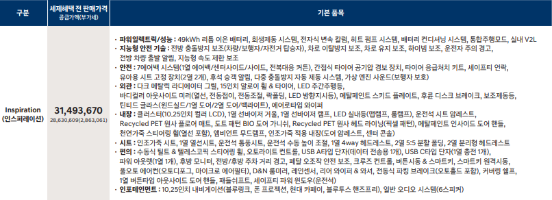 7월 9일부터 가격공개와 함께 사전계약이 시작되었습니다. 깡통 옵션(無 옵션)으로 3,149만 원으로 정해졌습니다. 세후 혜택 까지 받으면 2,900만 원대까지 내려갈 것으로 예상이 되네요.