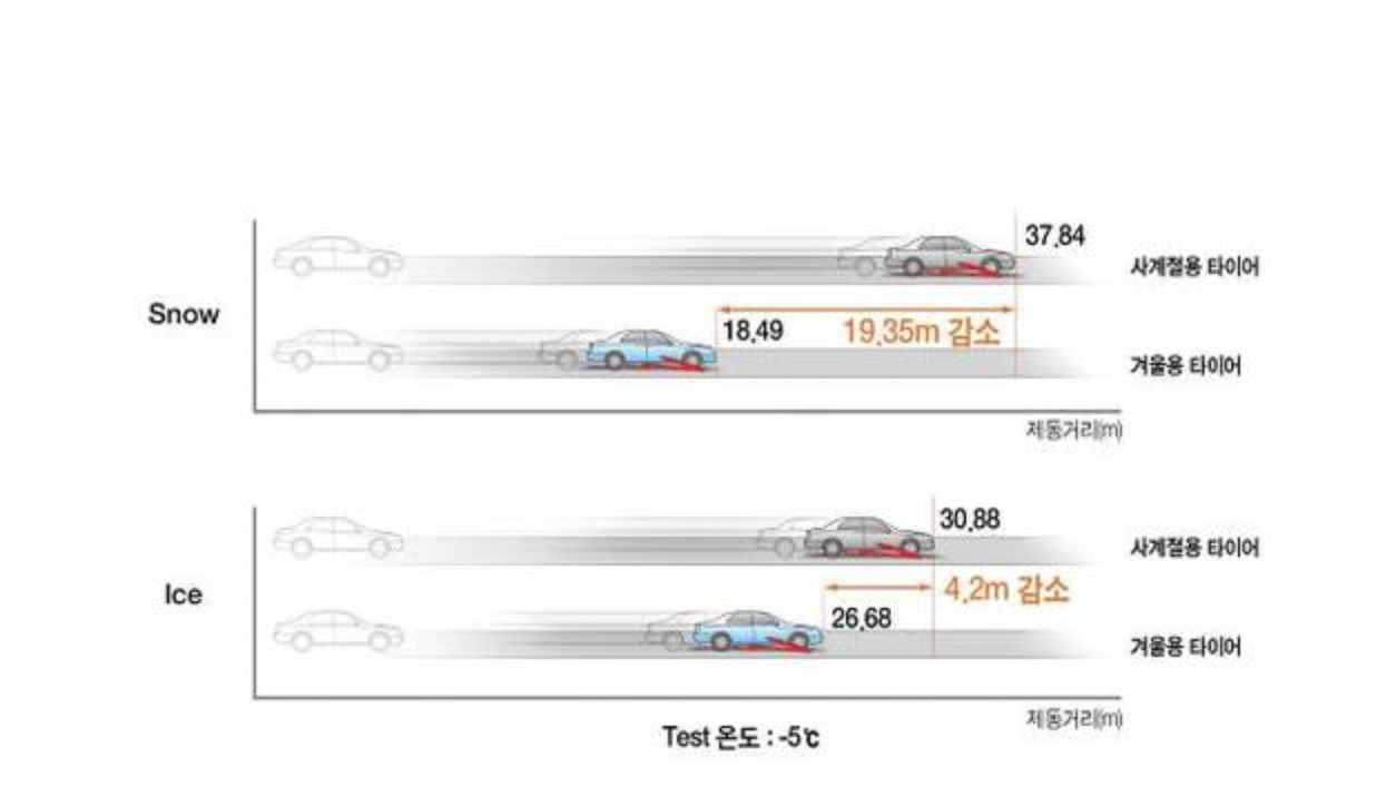 일반수입차들은 출고할때, 썸머타이어로 장착이 되어 나오는데요. 온도가 내려갈수록 썸머와 사계절타이어는 고무가 딱딱해져 접지력을 잃는 반면, 윈터타이어는 말랑말랑해지고 유연해져 효과적인 접지력을 유지 할 수 있습니다. 썸머보단 사계절로 바꿔 타시는것도 추천은 하지만 사계절타이어는 겨울철사용이 가능하다는 것 뿐, 완벽한 성능은 보이지 못합니다.