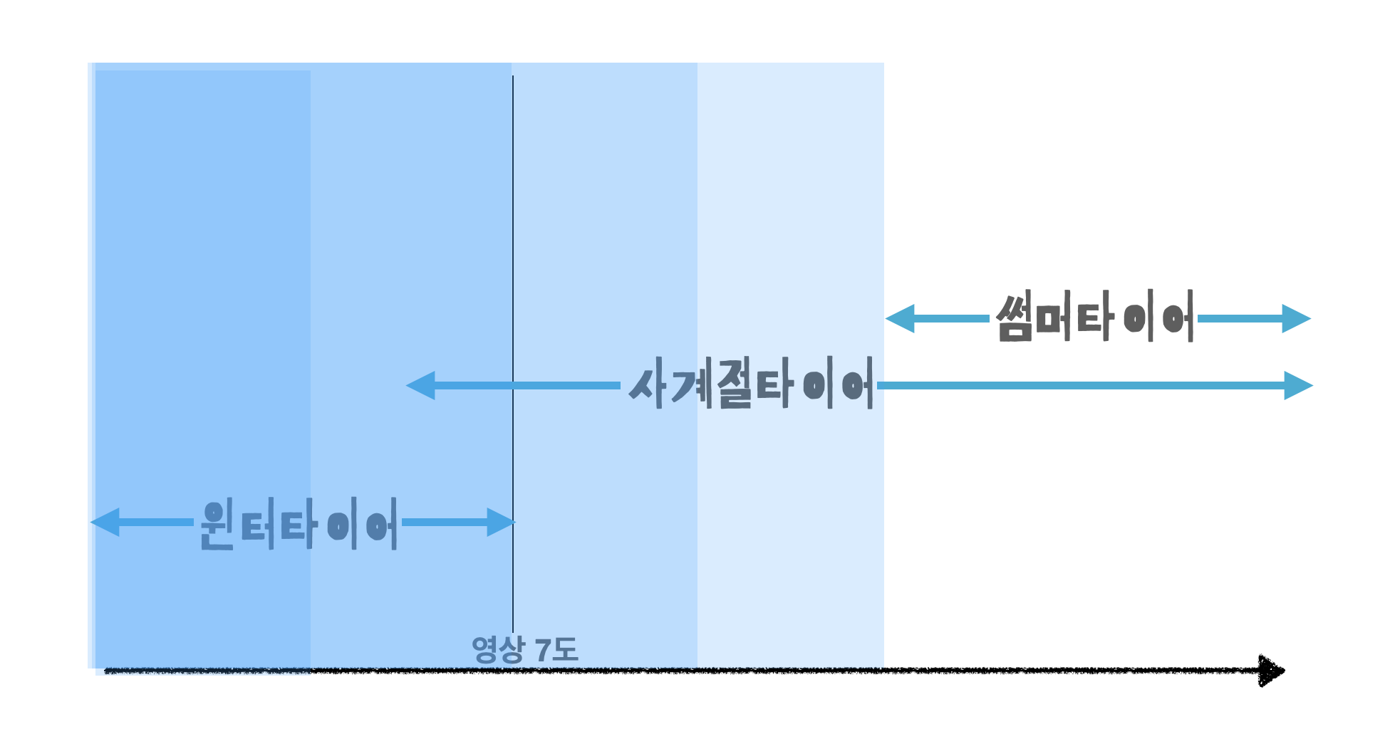 통상적으로 '영상7도'이하의 기온이 나타난다면 교체해주는것이 적당하다고 하네요. 눈이 안오고, 물이 얼지 않더라도, 블랙아이스는 영상7도 이하에서 만들어지고 녹고 하니까요!