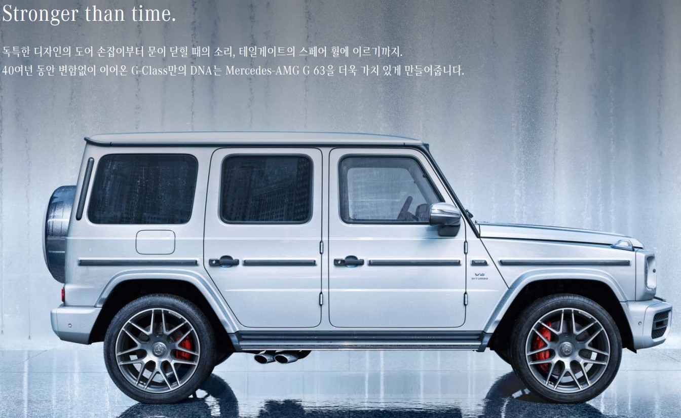 G바겐은 보기만해도 보디빌딩을 떠올리는 과한 근육질의 남자가 상상이 되곤 합니다. 엔진소리와 차체부터 광고에서도 그 면을 확실하게 보여주죠! G바겐 카탈로그를 봐도 '레이싱 트랙에서 태어나 오프로드를 달리다'라고 표현할 정도니까요. 이 모델은 SUV만 만드는 랜드로버와 비교대상이 많이 될겁니다. 실제로도 사막이나 산속을 거침없이 달리고, 물이 흐르는 계곡같은곳도 달리는 표지들이 많이 실려있을 정도니까요! 굳이 이런 차를 포장된 아스팔트위에서 왜 타나 싶겠지만, G바겐을 그 의심을 날려버릴정도로 충족하게 태어난 차 입니다.